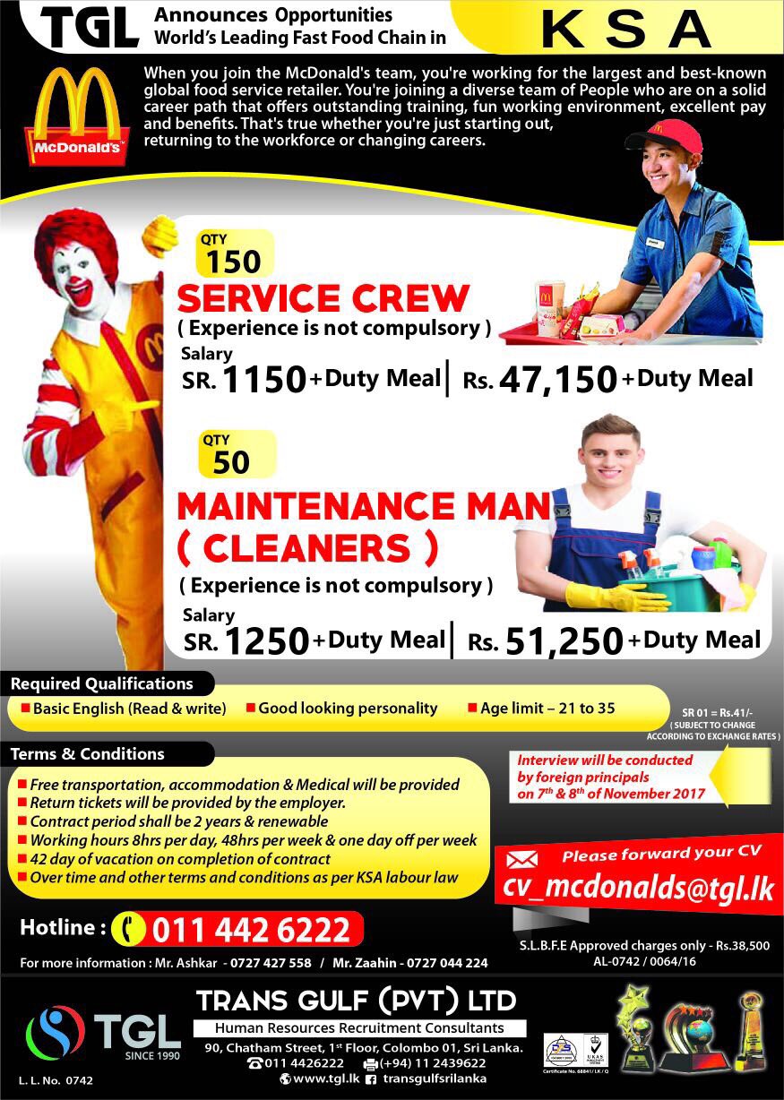 urgent vacancy in saudi arabia mc donald